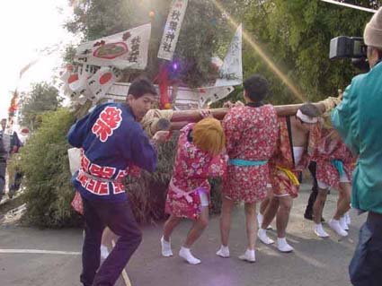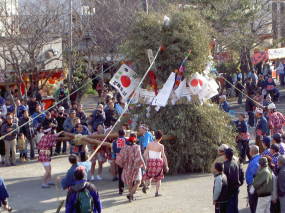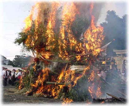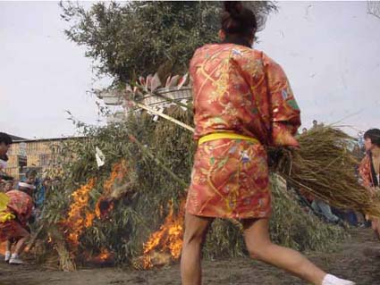 やがて午後一時ごろには、地元の町内を真っ先に左義長が境内につりこまれると<宮司の手から神前の忌火が氏子総代の介添えによって、裃姿に威儀を正した年番代表の手にもつ、とりつぎ藁にうつされる。まちかまえる若衆は手に手に藁で火を受け左義長にうつすと、千本近い青竹から火炎は天を焦がさんばかりポンポンと爆竹の音が神域一杯にこだまして祭りは最高潮となる。